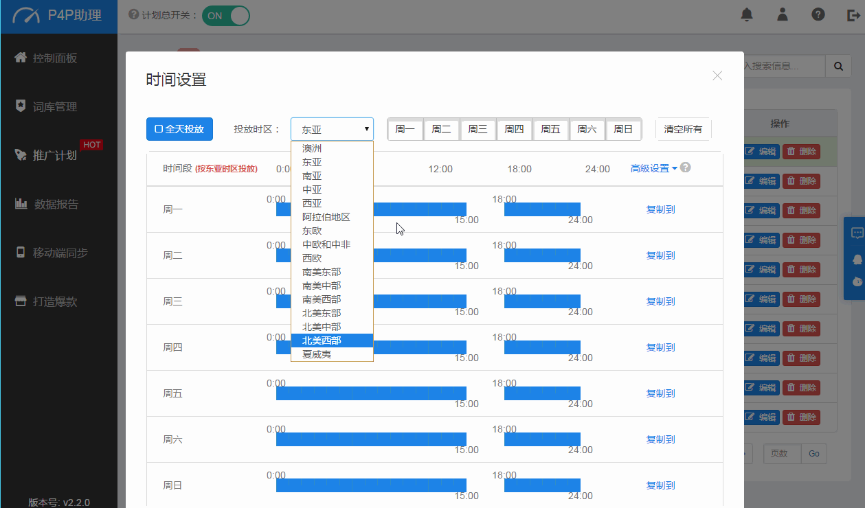 P4P助理帮你做!设置推广时区,主推你的市场,最大限度的避开你不想要的流量(比如阿三)